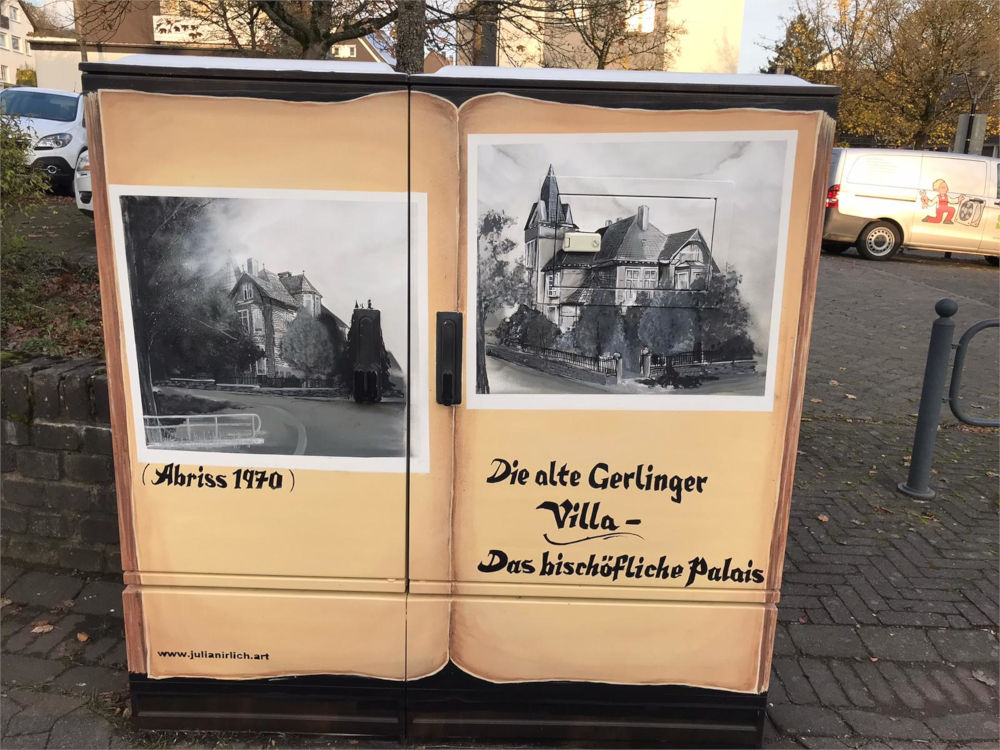 Auf dem Bischof-Willhelm-Platz stand bis zum Jahre 1970 die alte Gerlinger Villa. Ein imposantes Gebäude. Wir werden in naher Zukunft über die Geschichte des bischöflichen Palais berichten. Bis dahin, schaut euch den Kasten doch mal in echt an. (Im linken Bild, das weiße Geländer steht heute noch.)